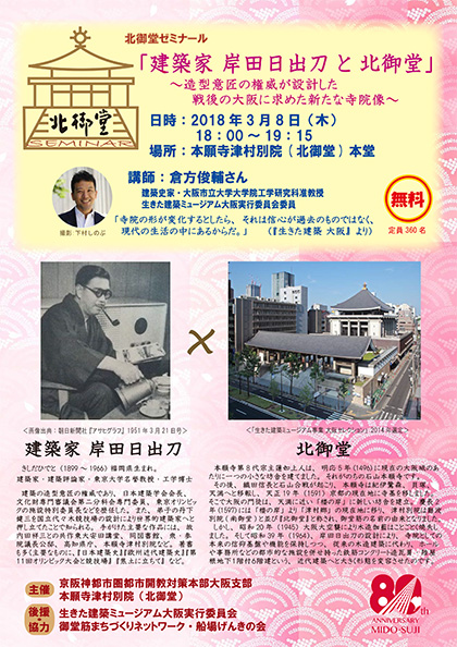 そこで、御堂筋完成80周年を記念して、日本建築学会会長、東京オリンピックの施設特別委員長などを歴任、弟子の丹下健三を国立代々木競技場の設計により世界的建築家へと押し上げたことで知られ、現在の北御堂の伽藍を設計・具現化した、建築家・岸田日出刀氏の目線を通して、寺院としての北御堂を深く掘り下げ、伝灯(伝統)とは何か、現代に生きる信仰とは何かを垣間見ていきたいと思います。