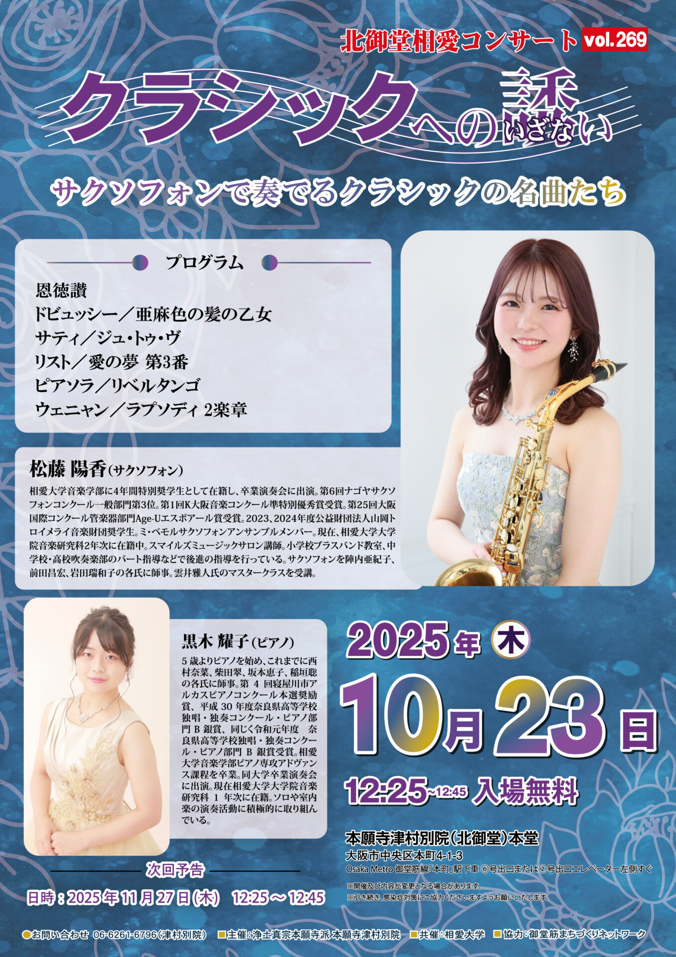 北御堂コンサートvol.269〜サクソフォンで奏でるクラシックの名曲たち〜開催(2025/10/23)