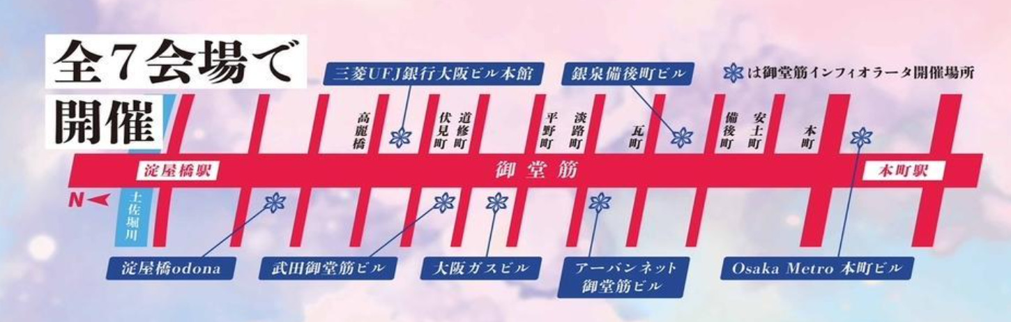 会場は、大阪ガスビル、淀屋橋odona、三菱UFJ銀行大阪ビル本館、武田御堂筋ビルなど、御堂筋沿いの7拠点。街を歩きながら花絵を巡ることができる仕掛けです。