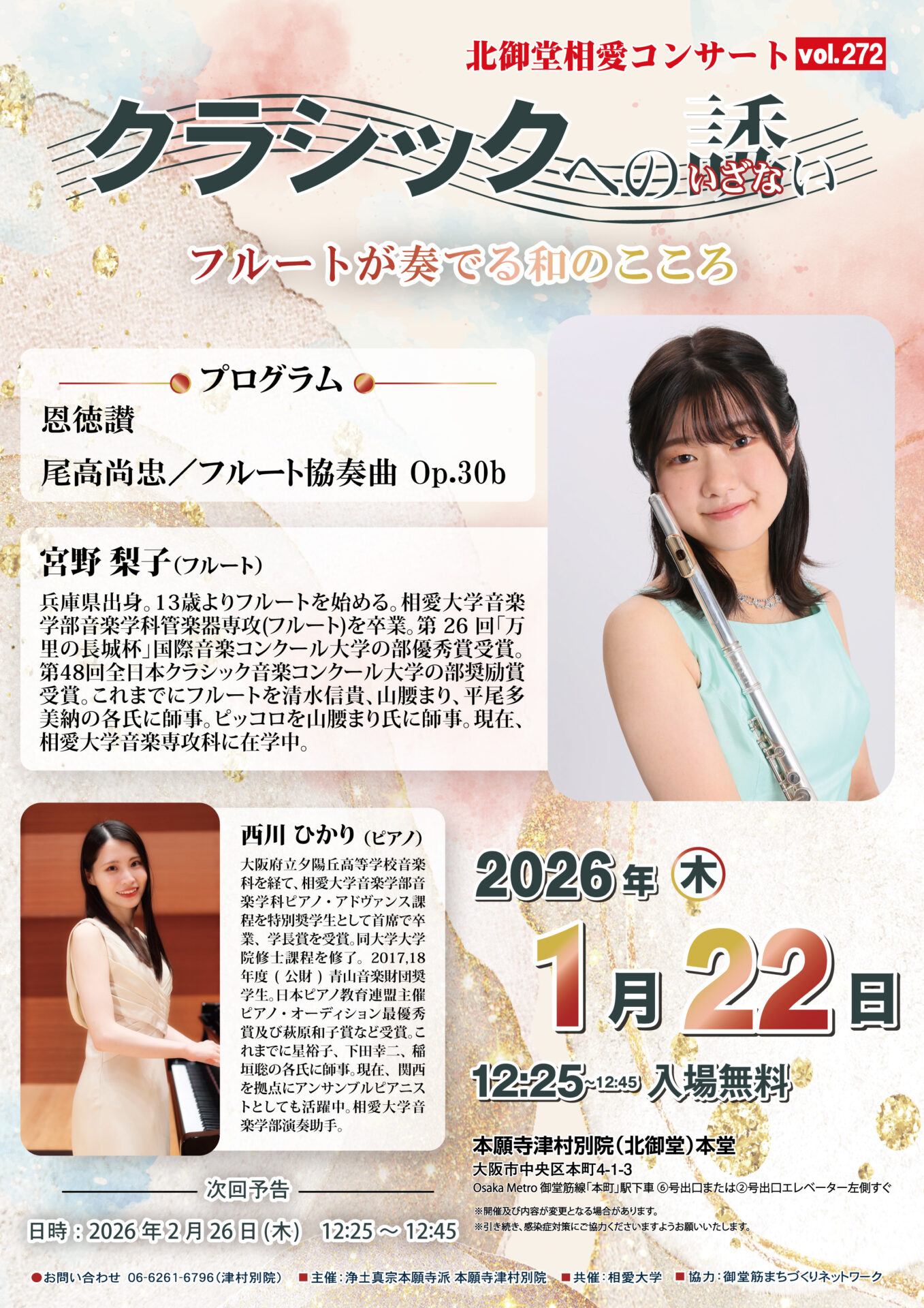 北御堂コンサートvol.272〜フルートが奏でる和のこころ〜開催(2026/1/22)
