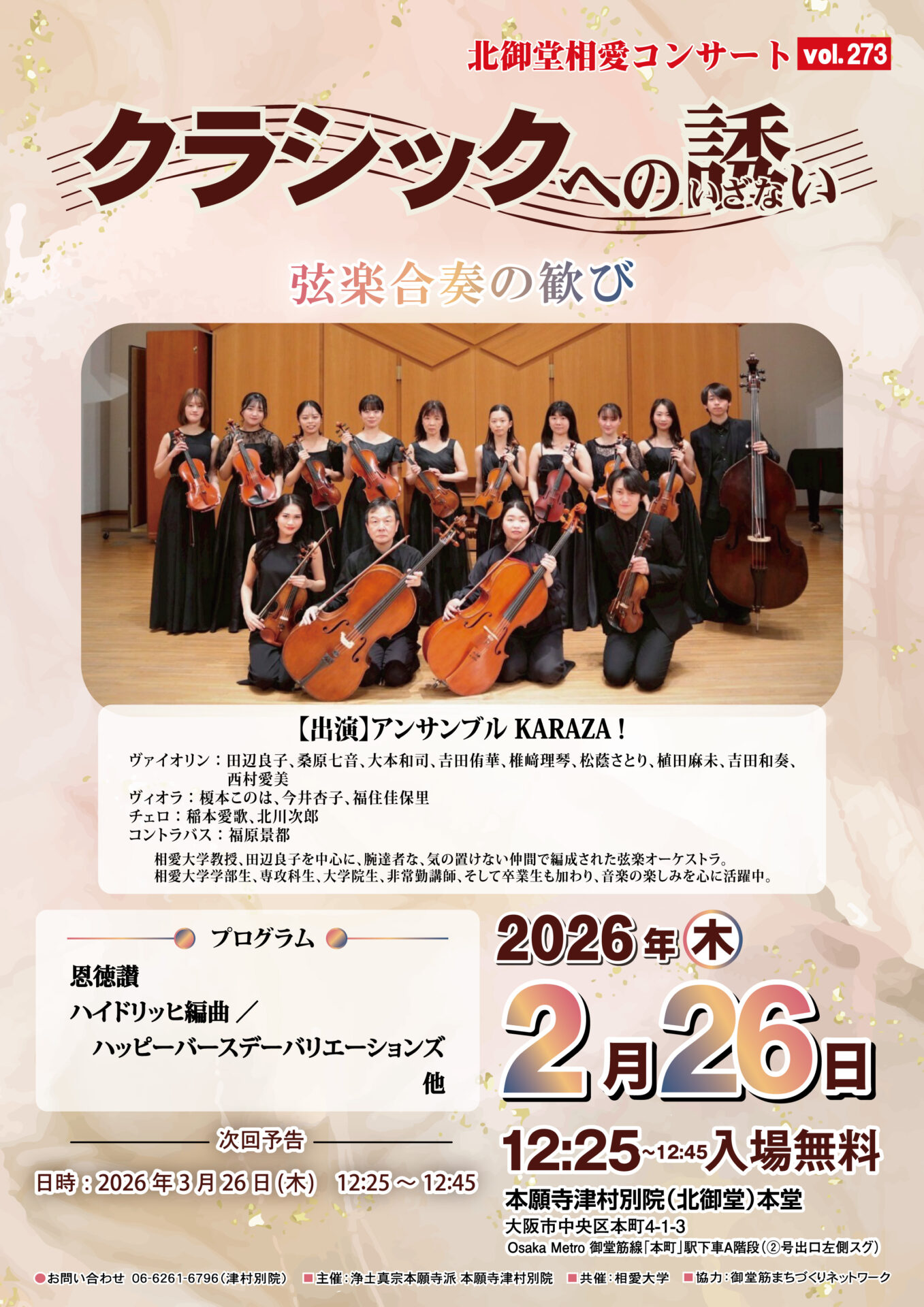 北御堂コンサートvol.273〜弦楽合奏の歓び〜開催(2026/2/26)