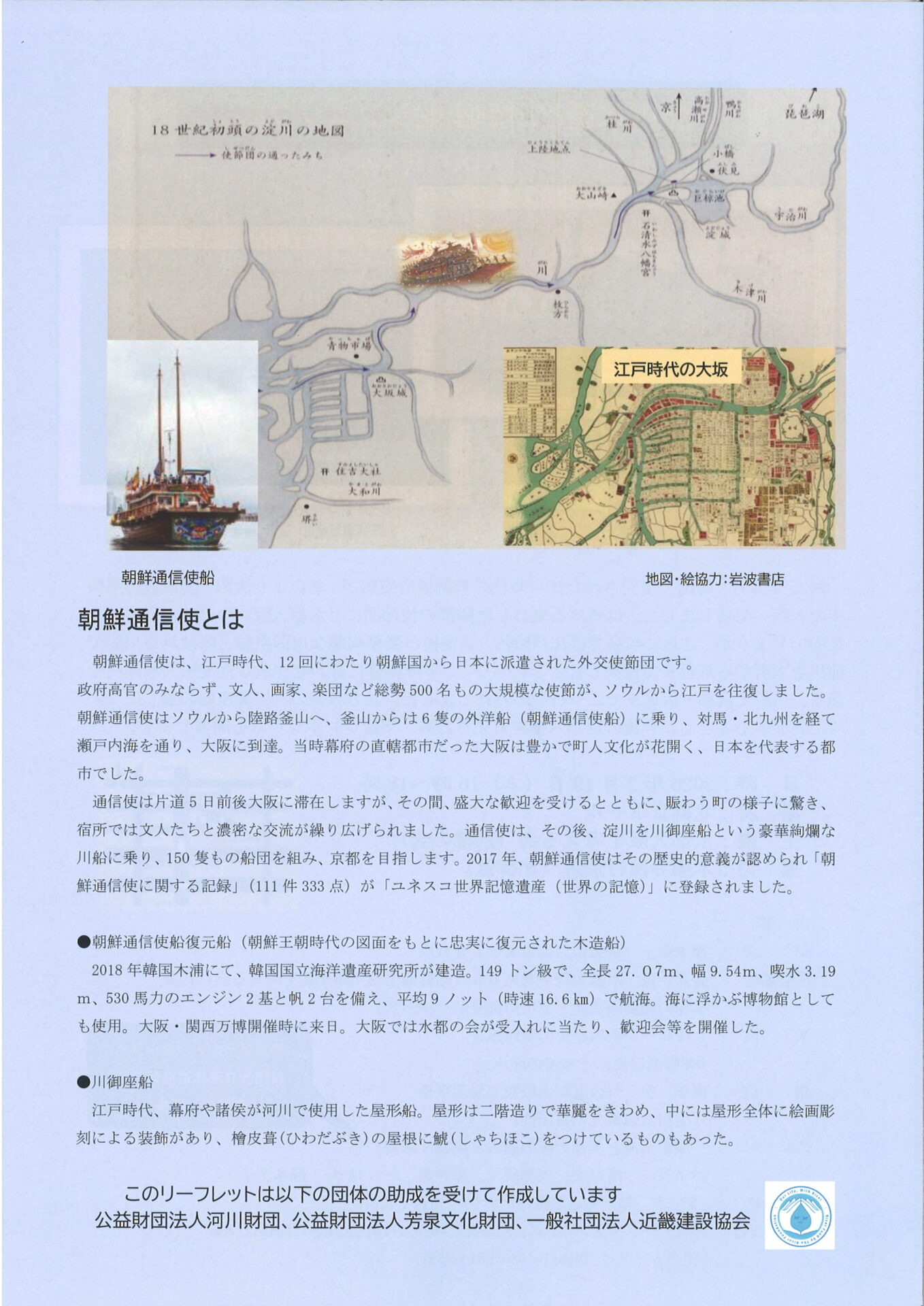 イベント2025年5月13日に大阪・関西万博「韓国ナショナルデー」が開催され、これに伴い大阪港に朝鮮通信使船復元船が来港し、また淀川閘門完成により川御座船が運行されました。