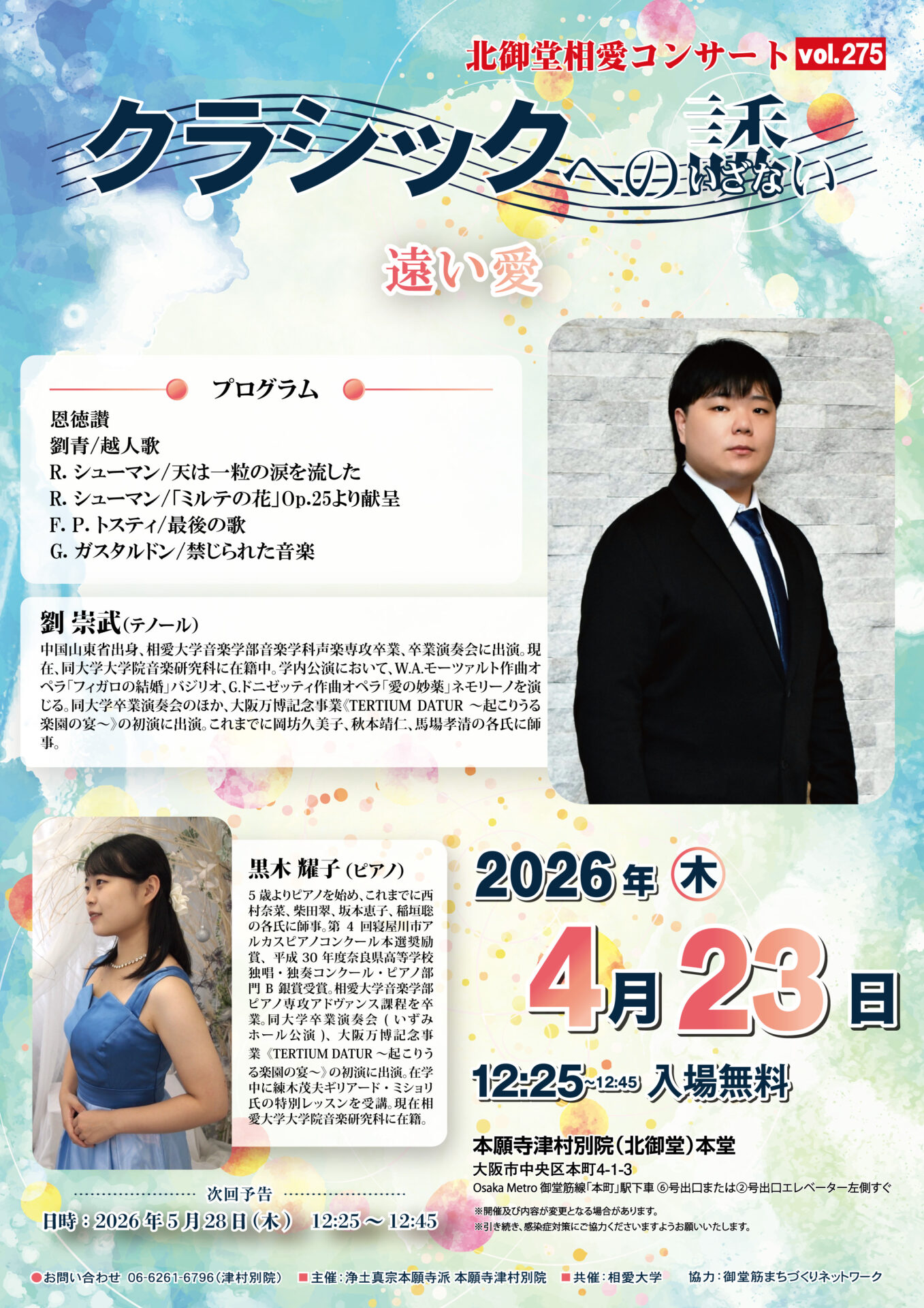 コンサート春爛漫の季節、新しい出会いと別れが交錯する時期に、北御堂コンサートを開催いたします。今回のテーマは「遠い愛」。テノールとピアノが奏でる心に染みる名曲の数々を通じて、時間や距離を超えた普遍的な愛の形を感じてみませんか。春の優しい光の中で、音楽が心に寄り添うひとときをお過ごしください。